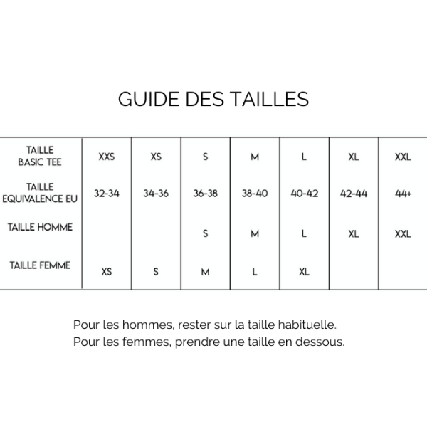 Guide des tailles : Si vous êtes un homme prenez votre taille habituelle et si vous êtes une femme, nous vous conseillons de prendre une taille en dessous.